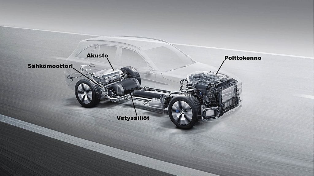 Piakkoin mukaan karkeloihin ilmoittautuu myös Mercedes GLC-pohjaisella polttokennoautollaan. Sen erikoisuus on se, että autossa on kohtuullisen iso ja pistokkeesta ladattava akusto, jolta voidaan syöttää virtaa sähkömoottorille. Sähköauto ja polttokennoauto ovat toki sukua toisilleen, sillä molemmissa voima pyörille siirtyy sähkömoottorilta. Polttokennoautossa tuo sähkö vain tuotetaan ajon aikana polttokennossa vedyn avulla.
