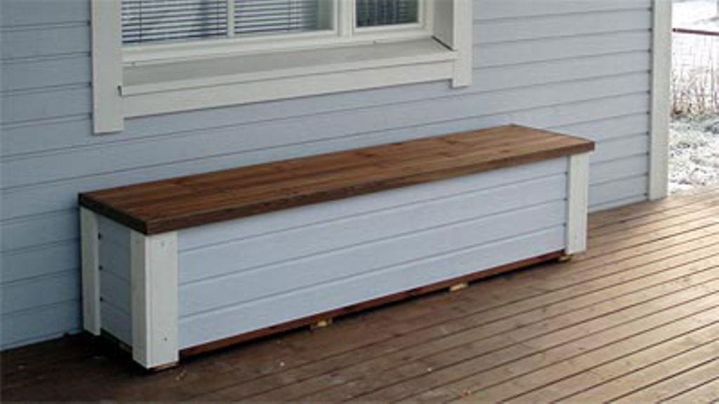 Ensimmäinen säilytyslaatikko oli kooltaan 200 x 40 x 60 cm (L x S x K) ja tarkoitettu puiden säilytykseen ulkoterassilla. Terassi on tehty ruskeasta painekyllästetystä laudasta ja talon seinä verhoiltu siniseksi maalatulla paneelilla.