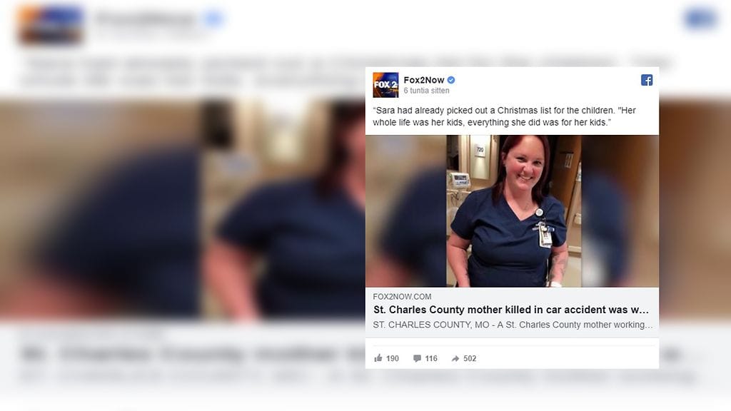Kuolonkolari sattui lauantaina puoli seitsemän aikaan illalla itään päin menevällä moottoritiellä lähellä Jungs Station Roadia Missourissa. Perheen mukaan Sara oli ollut matkalla työpaikalleen St. Louisin yliopistolliseen sairaalaan.