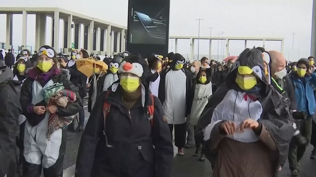 Suuri osa aktivisteista on pukeutunut pingviinipukuun, jolla he haluavat vahvistaa sanomaansa.
