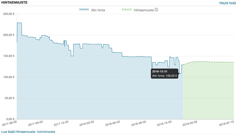 Jos olet tekemässä hankintoja, joita ei tarvitse hoitaa heti, on järkevää asettaa tuotteelle hintavahti ja vilkaista kyseisen tuotteen hintahistoriaa. Hintavahti ilmoittaa, kun valitsemasi tuotteen hinta laskee ja hintahistoriasta näet tuotteen hintavaihtelun ja onko sen saanut halvemmalla jonain muuna ajankohtana. Osalla tuotteista näkyvillä on myös hintaennuste-toiminto, joka arvioi, miten tuotteen hinta tulee kehittymään lähitulevaisuudessa.