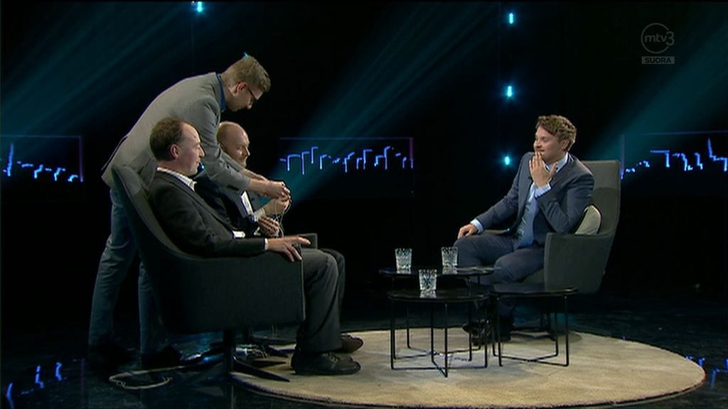 Suoran lähetyksen alussa laitteet asennettiin Terhoon ja Halla-Ahoon, jonka jälkeen Roope Salminen tenttasi kaksikkoa. Salminen huokaisi helpotuksesta seuratessaan koneen asennusta vieraaksi saapuneisiin miehiin.
