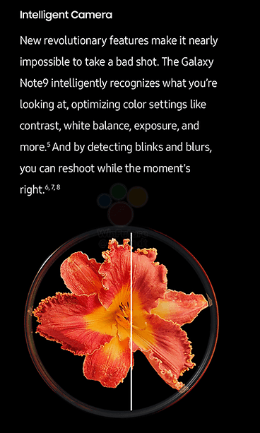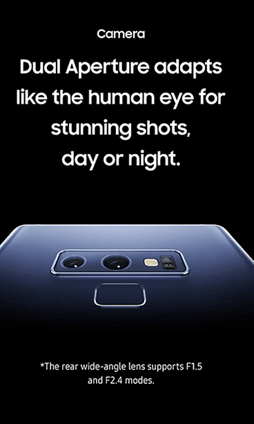 Galaxy Note9:ssä on kaksoistakakamera, joka on pitkälti samanlainen kuin Galaxy S9+:ssa. Toinen 12 megapikselin kameroista on varustettu vaihtuvalla aukolla ja toinen kamera tarjoaa taasen kaksinkertaisen optisen zoomin. Tällä kertaa Samsung on kuitenkin tuonut monien muiden valmistajien tapaan tekoälyominaisuuksia ja uusi Intelligent Camera säätää kuvausasetukset optimaalisiksi kuhunkin kuvaustilanteeseen.