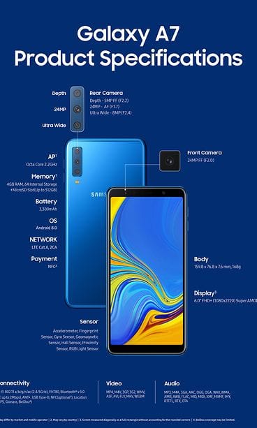 Myös takaa rakenteeltaan lasipintainen Galaxy A7 on varustettu 6,0 tuuman Super AMOLED -näytöllä 18,5:9-kuvasuhteella ja 2220×1080 pikselin tarkkuudella, kyljelle sijoitetulla sormenjälkilukijalla, kahdeksanytimisellä järjestelmäpiirillä 2,2 gigahertsin kellotaajuudella (ilmeisesti Galaxy A8:sta tuttu Samsungin Exynos 7885 Octa), 4 tai 6 gigatavulla RAM-käyttömuistia, 64 tai 128 gigatavulla sisäistä tallennusmuistia, microSD-muistikorttipaikalla sekä 3 300 milliampeeritunnin akulla. Liitäntä on valitettavasti vanhaa Micro-USB-mallia.