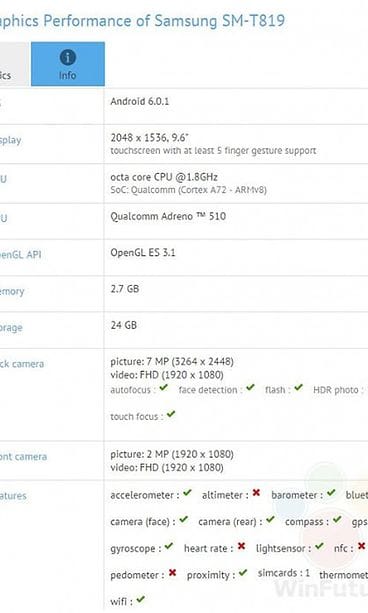 Samsungin Galaxy Tab S -sarja, eli Samsungin tablettimalliston uljaimmat, näyttäisi tänäkin vuonna saavan uusia jäseniä. Tällä kertaa ei kuitenkaan ole näkyvissä kovinkaan suuria muutoksia viimevuotisiin malleihin, mikäli tuoreeseen vuotoon on uskominen. Mahdollisista Galaxy Tab S3 -malleista löytyi viitteitä GFX Bench -testisovelluksesta.