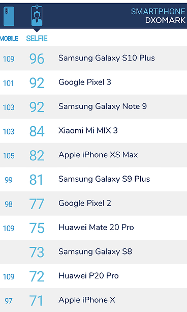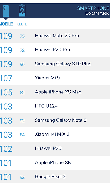 Galaxy S10+ sai DxOMarkilta takakameransa osalta 109 pistettä, jolla se yltää jaetulle ykkössijalle Huawein viime vuoden P20 Pro ja Mate 20 Pro -puhelinten kanssa.
