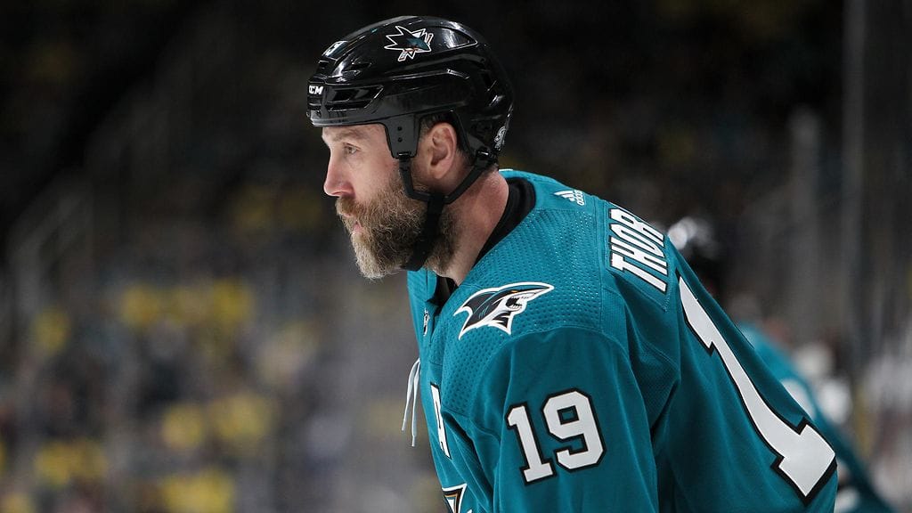 San Jose Sharksin 39-vuotias hyökkääjä Joe Thornton latoi kolme maalia Boston Bruinsin verkkoon yön NHL-kierroksella.