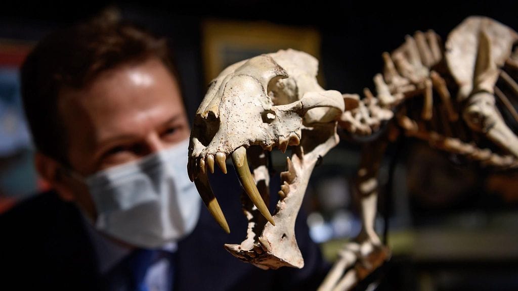 Lähes 40 miljoonaa vuotta vanha sapelihammaskissan luuranko myytiin 70 000 dollarilla (noin 58 000 eurolla) huutokaupassa Sveitsin Genevessä.