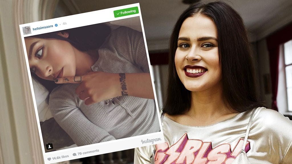 Nainen esittelee tuoretta kuvaa Instagramissa. Saara-taitelijanimellä esiintyvä tummahiuksinen kaunotar poseeraa kuvassa pitäen etusormeansa huultensa edessä. Katseensa hän on suunnannut sivulle.