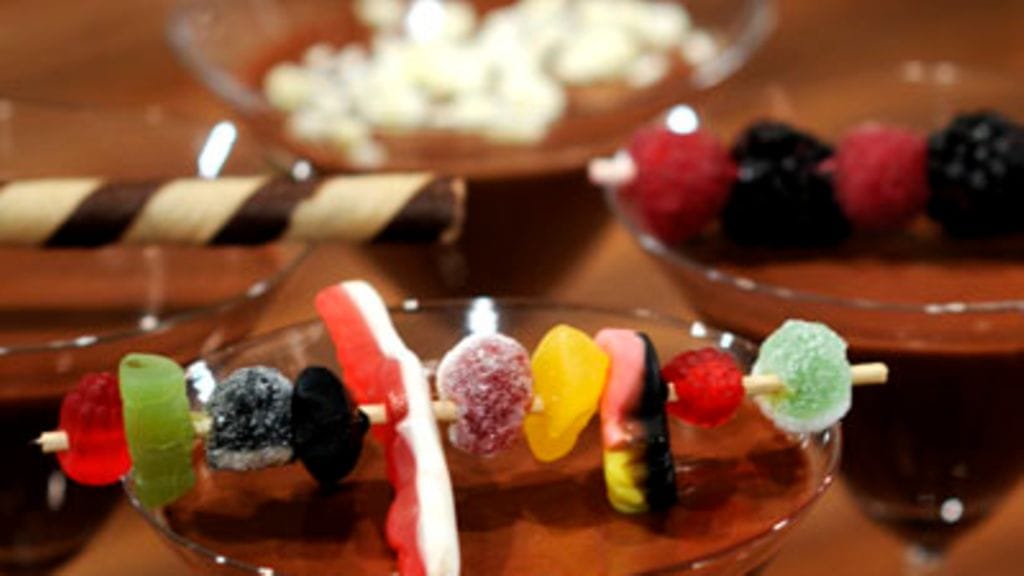 Voit koristella suklaamousset monella tavalla, esimerkiksi karkeilla, marjoilla, kekseillä ja vaikkapa valkosuklaalla.