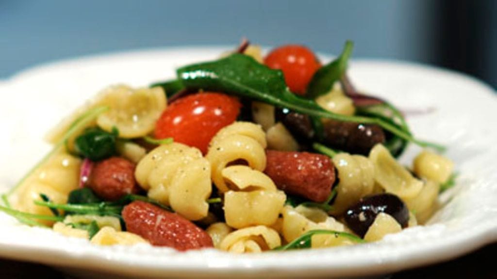Sekoita kulhossa sinappi, valkosipuli, sitruuna, hunaja, punaviinietikka ja oliiviöljy. Mausta kastike suolalla ja mustapippurilla. Lisää joukkoon keitetty pasta, oliivit, kirsikkatomaatit, minisalamit, parmesaanilastut ja punasipuli suikaleet. Lisää vielä lopuksi rucolan lehtiä ja sekoita aineet keskenään.