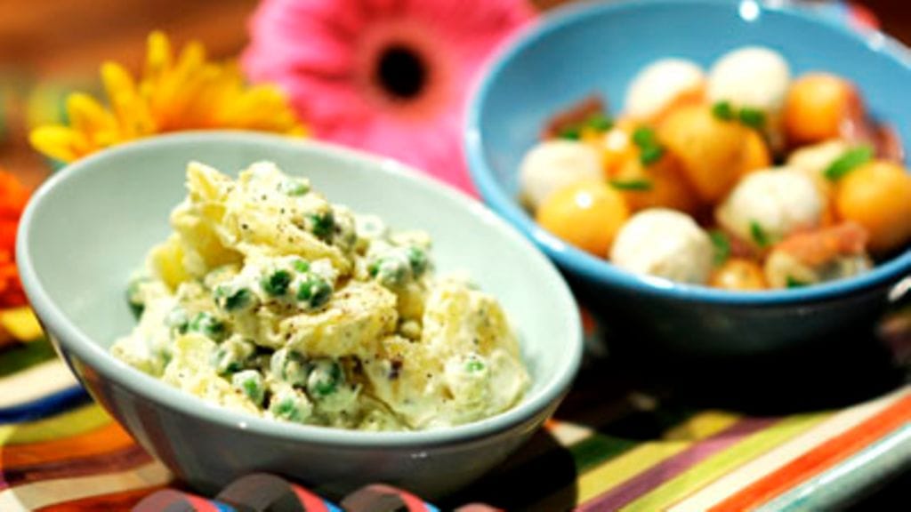 Ensimmäiseksi tee kastike: Sekoita kulhossa 4rkl majoneesia, 1rkl pestoa, loraus kermaa ja 1dl sulatettuja pakaste herneitä. Lisää valmis kastike perunaviipaleiden joukkoon. Lopuksi mausta perunasalaattia hieman mustapippurilla ja suolalla.