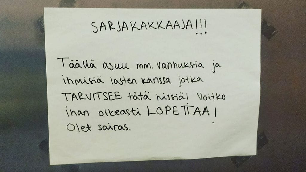 Tällaisen viestin Suurpellon Klarisentien taloyhtiön hissiin jätti asukas, jonka mitta tuli täyteen. Hänen asuintalonsa hissiin on ilmestynyt viimeisen kuukauden aikana jo neljä kertaa haiseva ja epämiellyttävä yllätys.