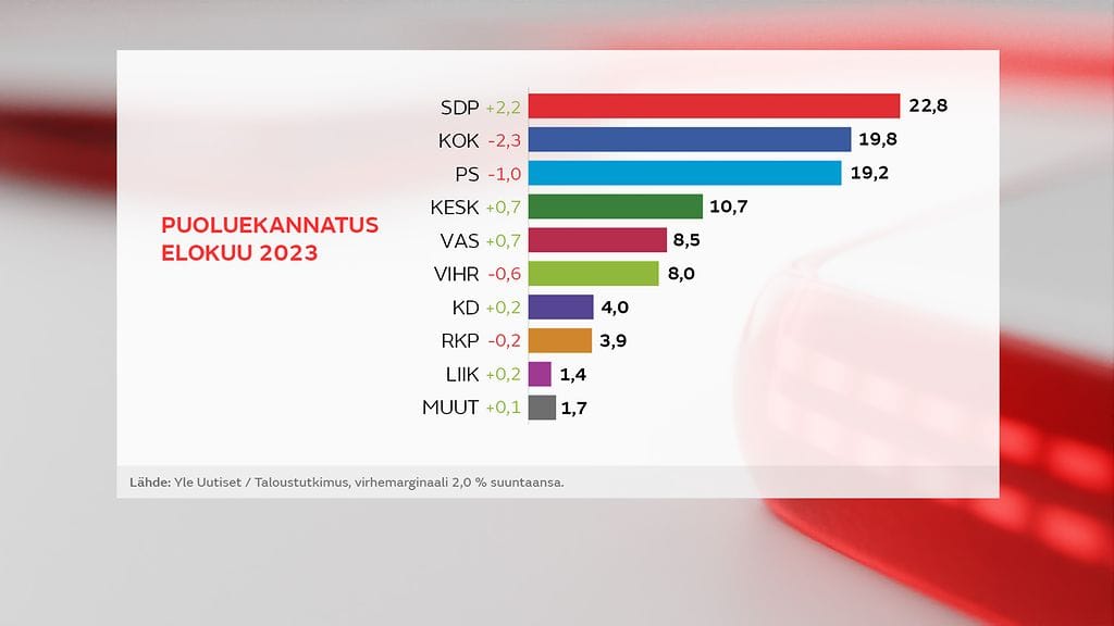 SDP on noussut Ylen kannatusmittauksessa suosituimmaksi puolueeksi 22,8 prosentin kannatuksella. Nousua edellisestä kannatusmittauksesta on 2,2 prosenttiyksikköä.