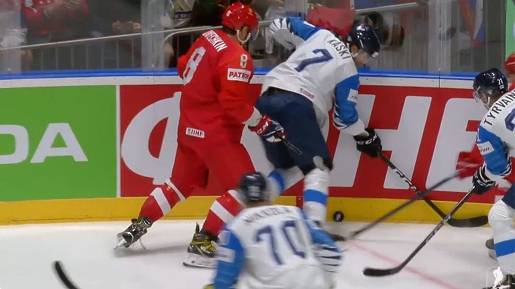Venäjän Aleksander Ovetshkin tarjosi rajusti poikittaista mailaa Leijonien puolustajalle Oliwer Kaskelle, joka hämmästeli kumpaakin saamaansa rangaistusta.