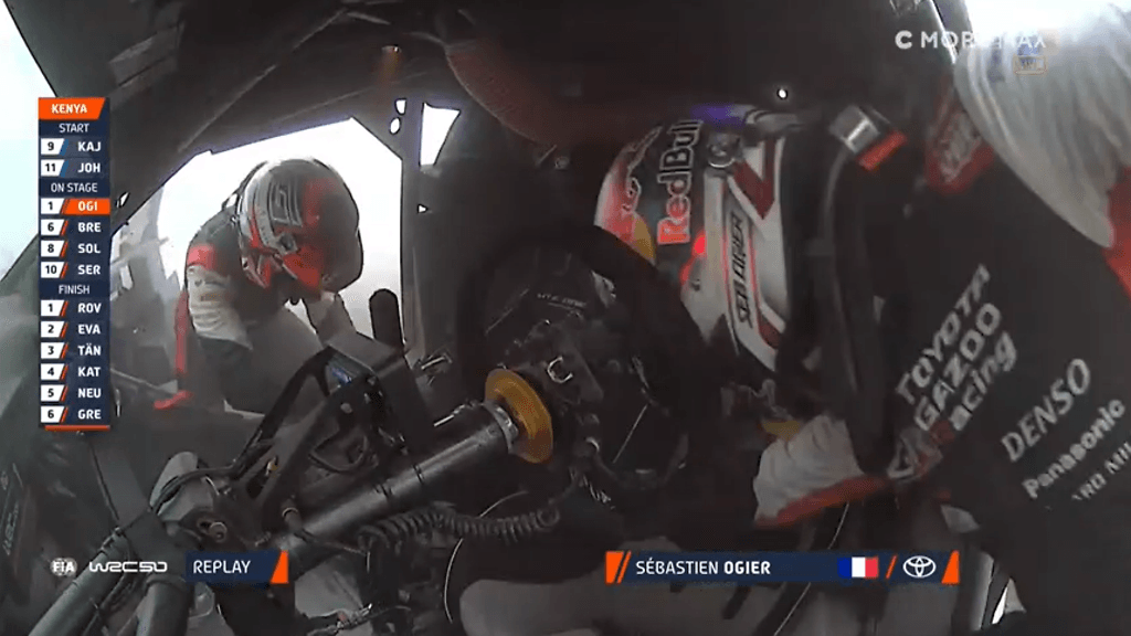 Kun Ogier huomasi renkaan puhjenneen, kuljettaja pysäytti autonsa välittömästi. Vaihtotoimenpiteet suoritettiin päätä huimaavalla tahdilla.