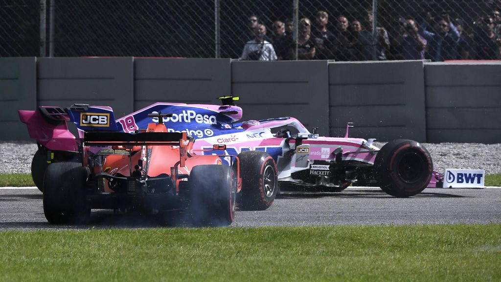 Sunnuntain kisassa Vettel pyörähti mutkien 8-10 yhteydessä, Variante Ascarissa. Pyörähdyksen jälkeen hän palasi radalle hyvin uhkarohkealla tavalla. Liikkeelle lähtö johti siihen, että hän osui Racingin Pointin Lance Strollin auton peräosaan. Stroll pyörähti osuman myötä.