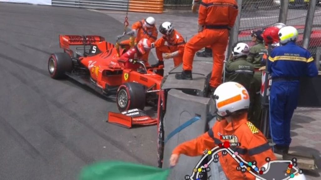 Sebastian Vettel laittoi Ferrarin mekaanikot töihin ennen Monacon F1-kisan aika-ajoja rysäytettyään autonsa seinään lauantain harjoituksissa.