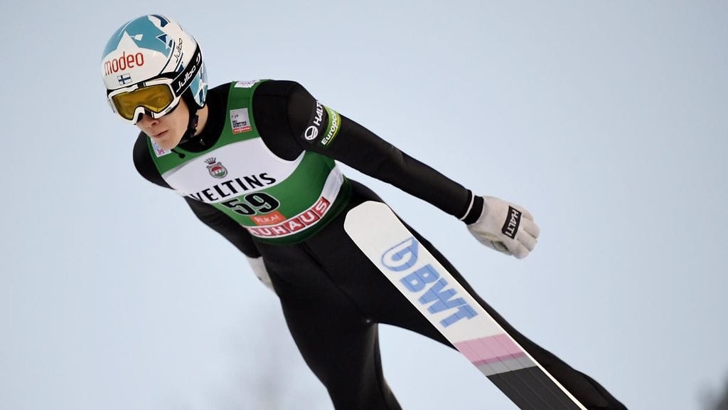 Antti Aalto leiskautti pisimmän hypyn mäkihypyn harjoituskierroksella Rukalla lauantaina.