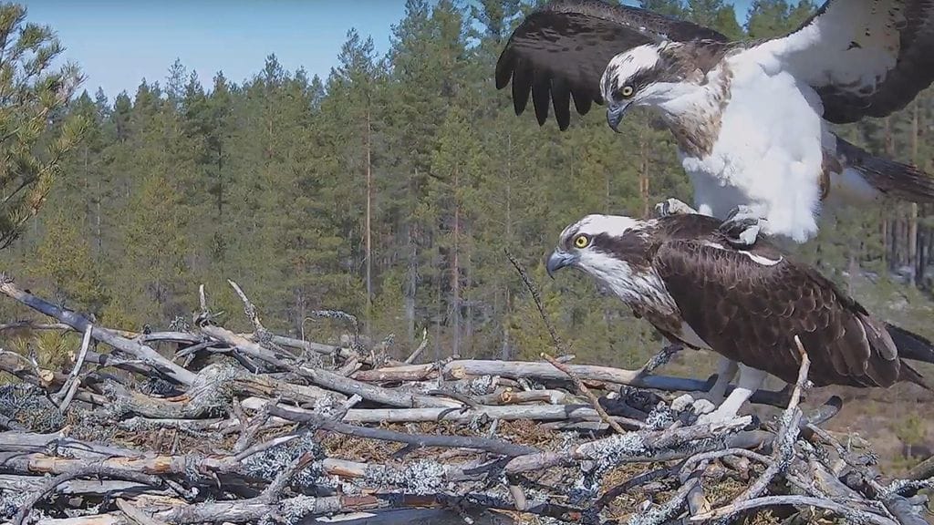 – Vasta eilen pesän rakentaminen pääsi kunnolla käyntiin. Välillä on pariteltu ahkerasti ja välillä ajettu tunkeilijoita pois, Satakunnan kalasääskien virallisella Facebook-sivulla kerrotaan.
