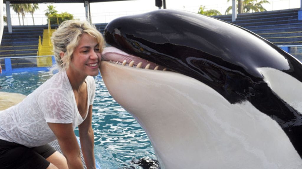 Shakira jopa uskaltautui vastaanottamaan vetisen suukon miekkavalaalta, jota kutsutaan myös tappajavalaaski: kuvassa miekkavalas koskettaa Shakiran kasvoja hurjan suurella kielellään, terävät hampaat esillä. Miekkavalaan hampaat ovat arviolta 7,6 senttimetriä pitkät.
