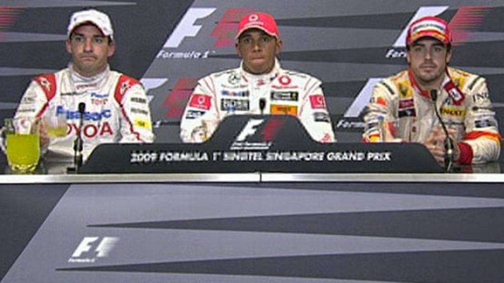 Singaporen GP:n lehdistötilaisuudessa paikalla kisan kolme parasta: voittaja Lewis Hamilton (LH), toiseksi sijoittunut Timo Glock (TG) sekä kolmanneksi ajanut Fernando Alonso (FA).