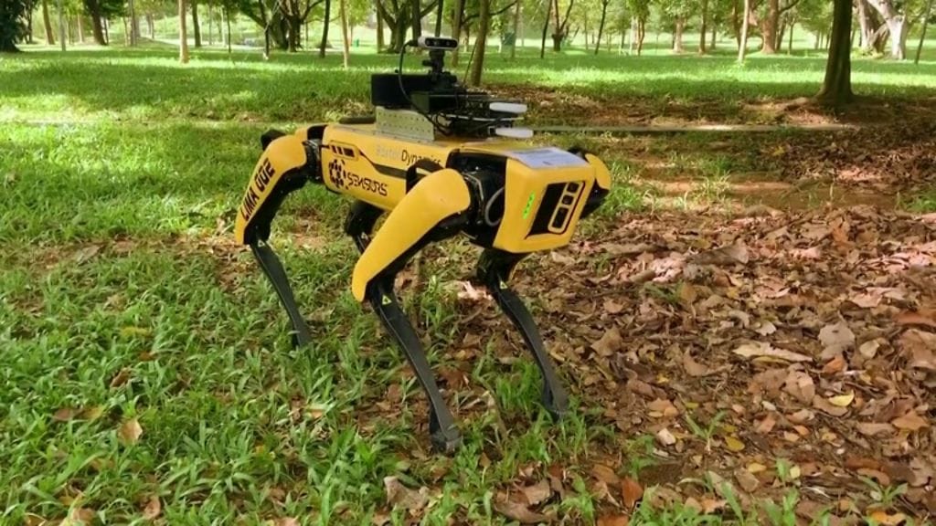 Singaporessa esiteltiin perjantaina nelijalkainen koiramainen robotti, joka kulkee ympäri puistoa ja muistuttaa kävijöitä sopivista turvaväleistä.