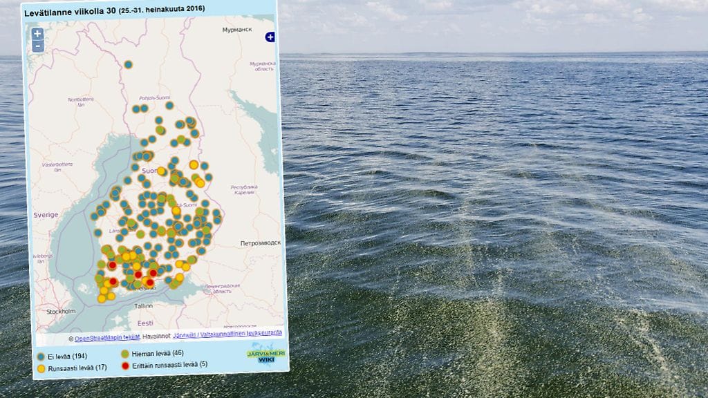 Suomen ympäristökeskuksen interaktiivisesta kartasta voit tarkastella sinilevähavaintoja eri suomalaisjärvissä. Kartalla näkyvät Järvi-meriwiki-palveluun tallennetut ja korkeintaan viikon ikäiset sinilevähavainnot.