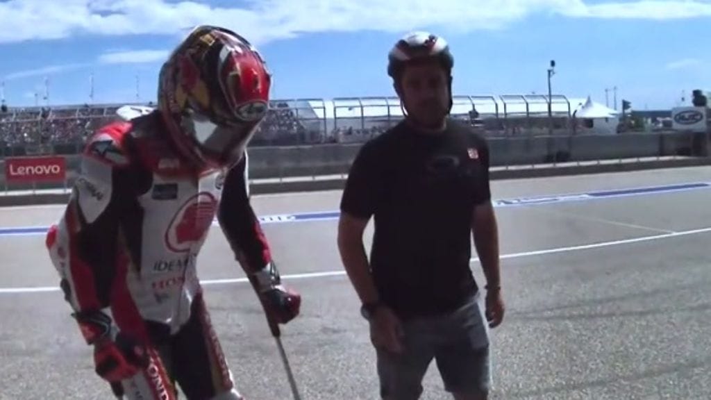Nakagami joutuu kävellessään käyttämään kyynärsauvoja, mutta selvästikään vamma ei hidasta japanilaisen vauhtia pyörän päällä. Aika-ajojen päätösosiossakaan Nakagami ei joutunut nöyrtymään, vaan otti lopulta 10. lähtöruudun huomiseen kilpailuun. Lajilegenda Valentino Rossikin jäi taakse.