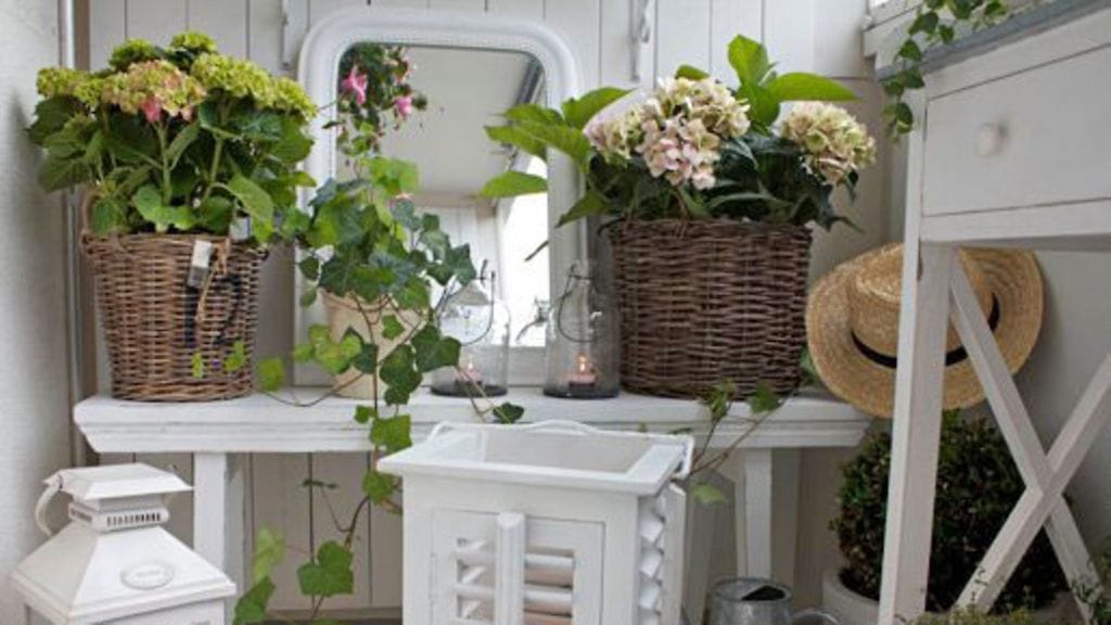 Sisustusalalla työskentelevä rouva suunnitteli parvekkeensa samoilla aineksilla, millä muukin huoneisto on sisustettu. On valkoista, lautaa, rottinkia, sinkkiä, viherkasveja ja harkittuja yksityiskohtia. Kokonaisuus on hallittu, kun valitusta värimaailmasta ei lipsuta kuin ehkä muutaman vaaleanpunaisen pelargonian verran.