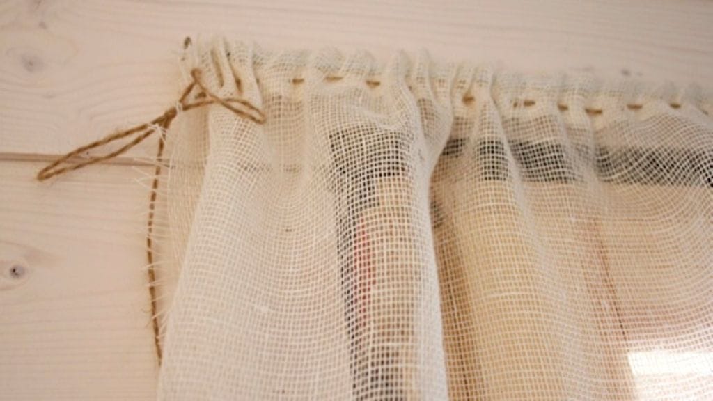 Mökin keittiöstä löytynyt edellisen omistajan vihreä naulakkohylly maalattiin valkoiseksi ja naulattiin hyyskän seinään pyyhenaulakoksi. Pyyhe sai kaverikseen myös mökiltä löytyneen harmaaksi patinoituneen melan, jonka koristeeksi emäntä kieputti pari kierrosta narua.