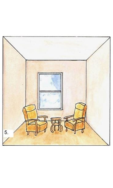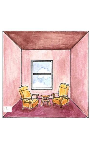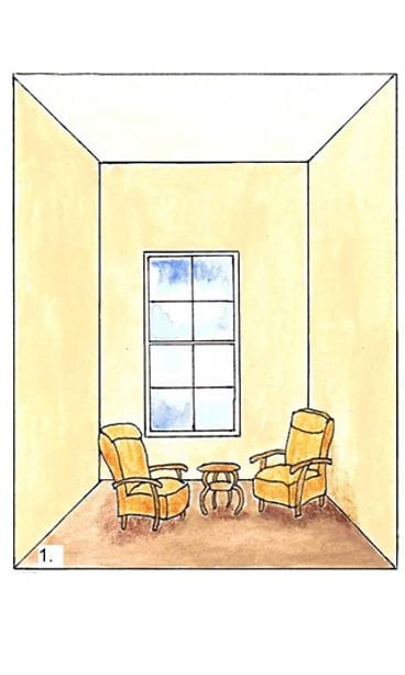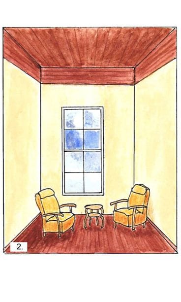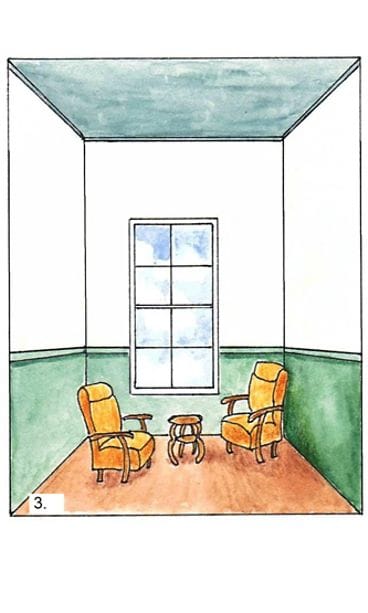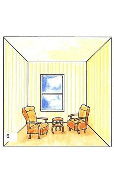 Oheisissa piirroksissa on yksinkertaistaen esitetty värien vaikutusta tilaan. Ensimmäisessä kuvassa on korkea, kapea huone, joka saadaan vaaleilla seinillä ja valkoisella katolla näyttämään avaralta ja selkeältä.