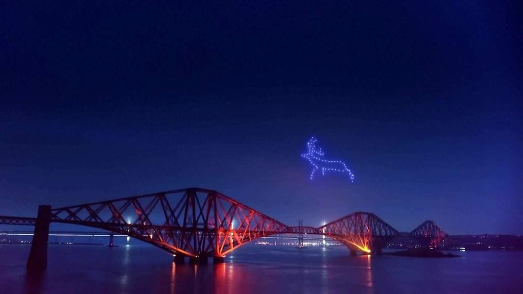 Skotlannissa tummaa taivaanrantaa väritti upea lukuisten drone-lennokkien muodostama valonäytös, kertoo uutistoimisto Reuters.