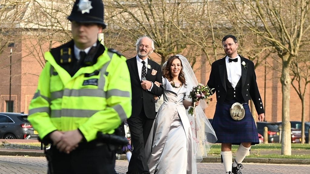 Morisin, 30, hääpuvun suunnitteli maineikas muotisuunnittelija Vivienne Westwood, joka on pitkään tukenut Assangea. Australialainen Assange, 50, käytti häissä kilttiä viittauksena skotlantilaisiin juuriinsa.