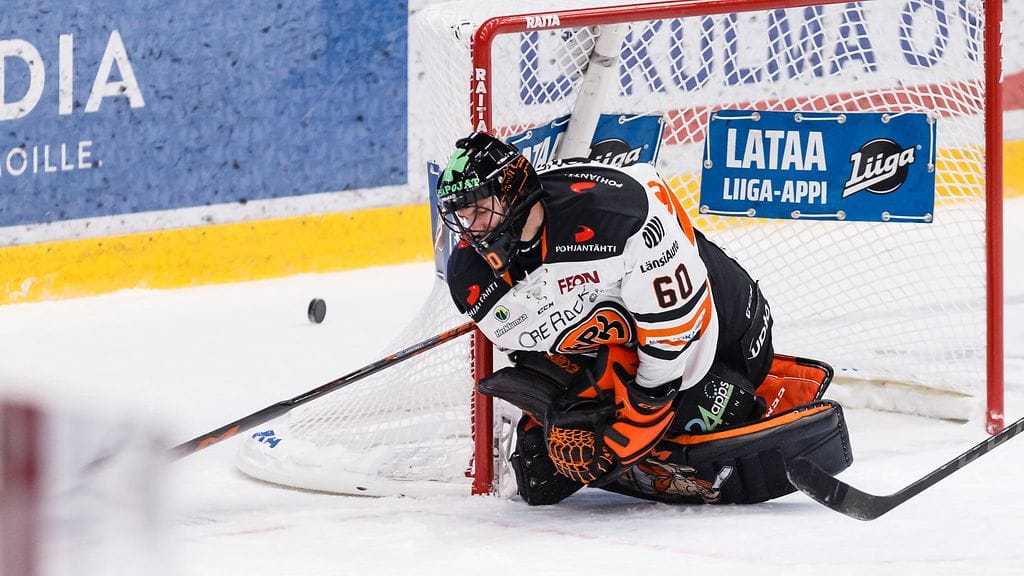 HPK:n maalivahti Daniel Lebedeff pelaa kiekkoa harjoituspelissä Ilvestä vastaan maalin takana. Hän on maalin taakse piirretyn alueen sisällä, mutta kiekko ja lapa ovat ulkona.