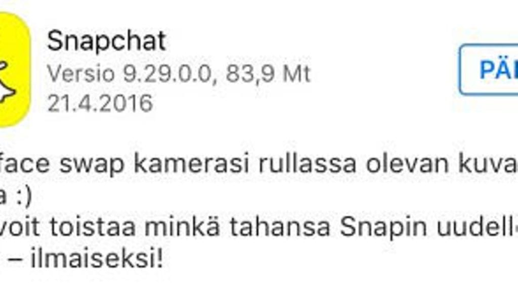 Suosittu kuva- ja viestisovellus Snapchat on päivittynyt. Sovellus saa nyt face swap – naamanvaihtomahdollisuuden aiemmistakameran rulla -kuvista. Samalla Snapchat on luopunut sovelluksensa ainoasta käyttäjille maksullisesta mahdollisuudesta.