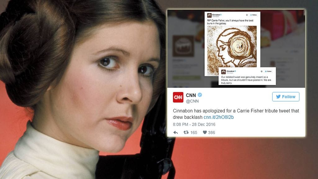 Star Wars -elokuvista tuttu näyttelijätähti Carrie Fisher kuoli tiistaina 27. joulukuuta. Cinnabon-nimisen leivonnaisalan yrityksen Twitterissä julkaisema kuva, jossa kierrepulla oli aseteltu esittämään Fisherin tunnetusti esittämän prinsessa Leian näyttävää hiusnutturaa, herätti raivoa sosiaalisessa mediassa.