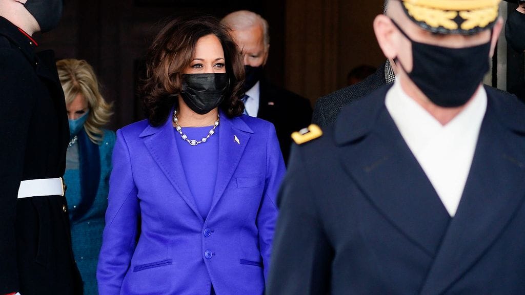 Harris oli pukeutunut virkaanastujaisissa tyylikkääseen violettiin housupukuun. Tyyli on kruunattu vaaleilla helmillä.