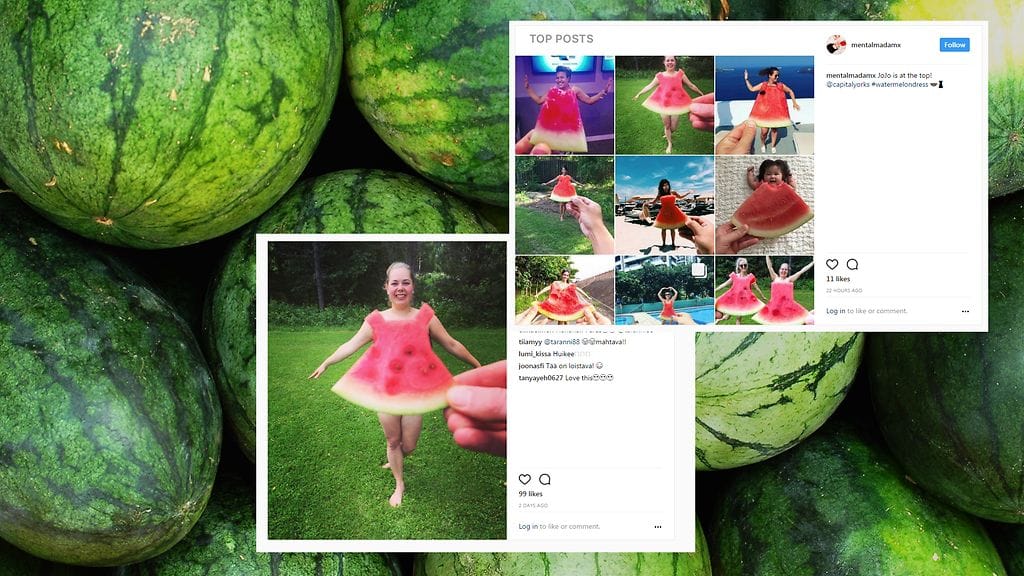 Sosiaalisen median viimeisin villitys on #watermelondress, suomennettuna vesimelonimekko. Haasteessa vesimelonista leikataan pala, jonka takana kuvattava poseeraa.