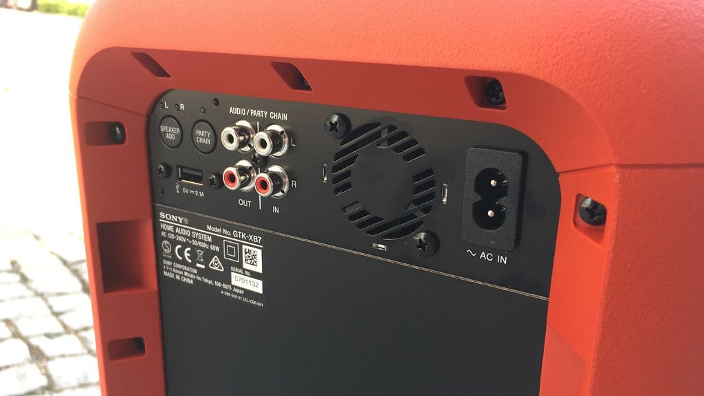 Sony GTK-XB7 on järeän näköinen ja kokoinen kaiutin, joka on tarkoitettu nimenomaan helposti siirrettäväksi bileiden keskipisteeksi. Kaiutin on saatavilla mustana, sinisenä ja punaisena.