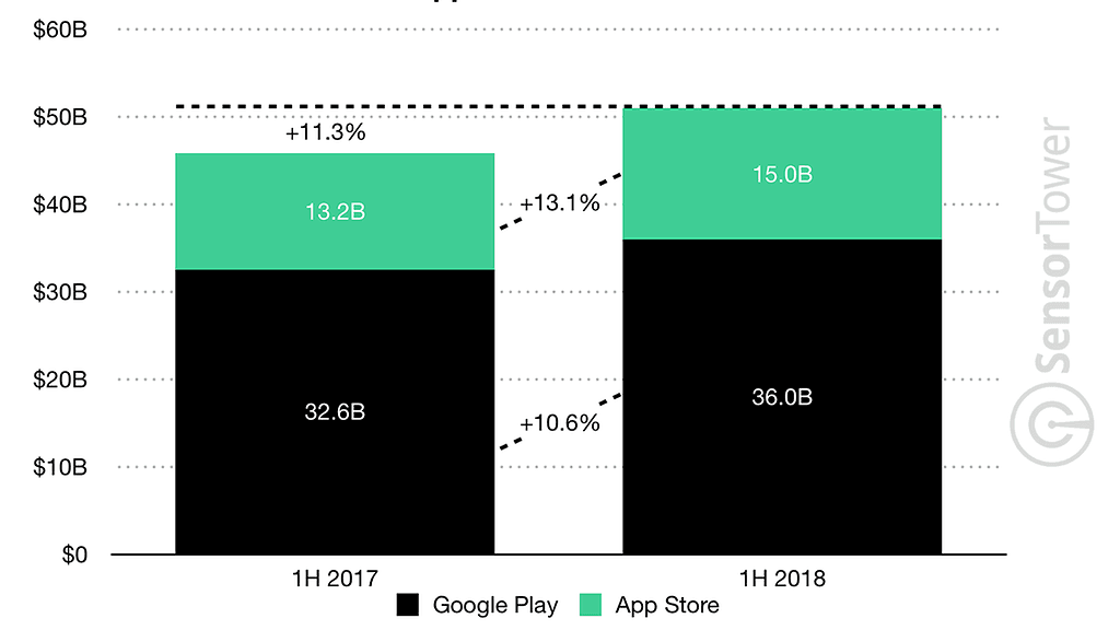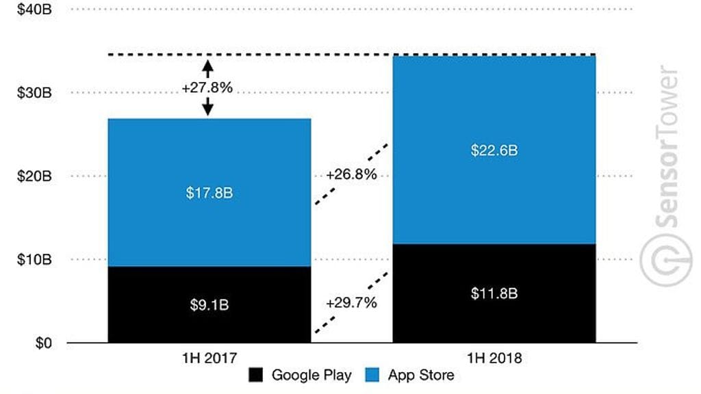 Kuluvan vuoden ensimmäisen puoliskon aikana sovelluskaupoissa kulutettiin rahaa yhteensä runsaat 29 miljardia euroa, kertovat Sensor Towerin tilastot. App Store kaappasi valtaosan tuloista.