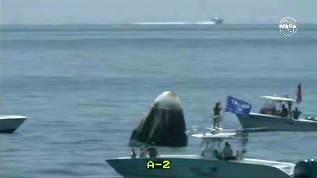 Videolla näkyy myös, miten ”huviveneilijöitä” pääsi kapselin luo. Yhdessä veneessä liehui presidentti Trumpin lippu. Miehistön nostamista merestä uteliaat ihailijat eivät kuitenkaan haitanneet. Kapselille oli varattu seitsemän vaihtoehtoista laskeutumispaikkaa.