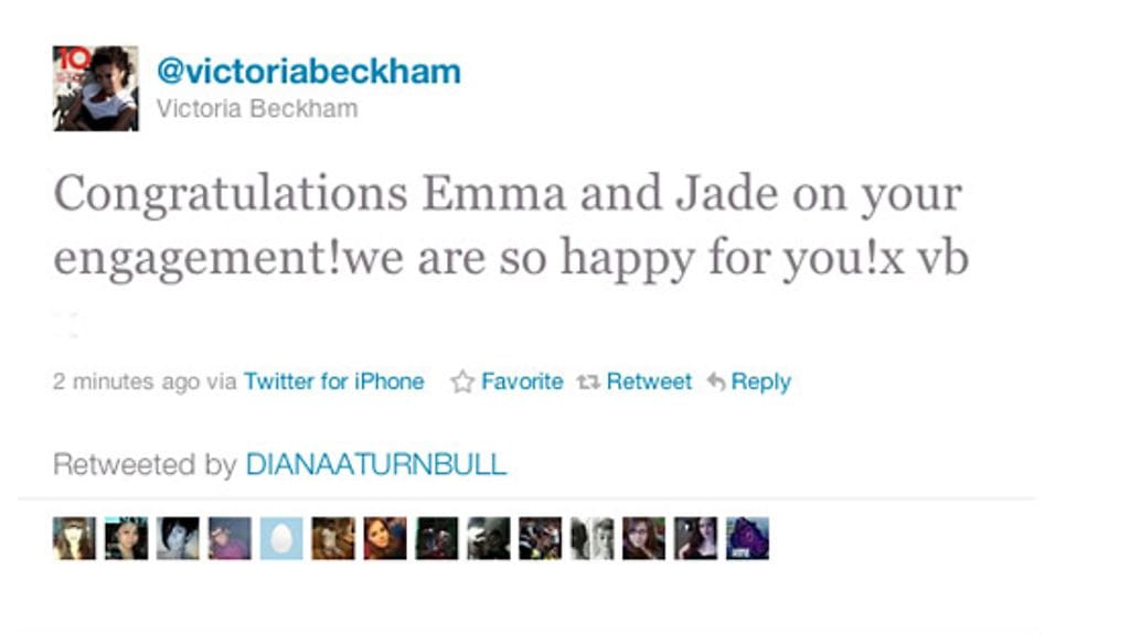 Spice Girlsistä tutut Victoria Beckham ja Mel C onnittelivat heti entistä bändikaveriaan – missäpä muualla kuin Twitterissä.