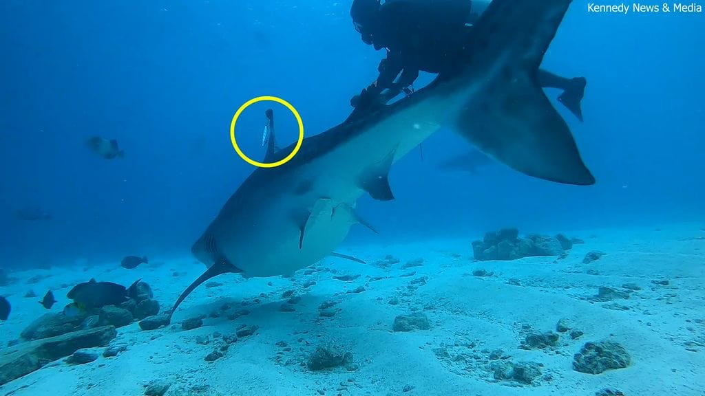 Koukun irrottaminen ei ollut tehtävä turvallisimmista päästä: Tiikerihai on isokokoinen hailaji, joka tunnetaan myös verenhimoisena saalistajana.