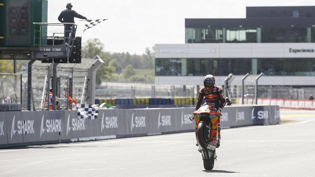 Tallipäällikkö Aki Ajon KTM-talli juhli kaksoisvoittoa Moto2-luokan Ranskan osakilpailussa Le Mansin radalla.
