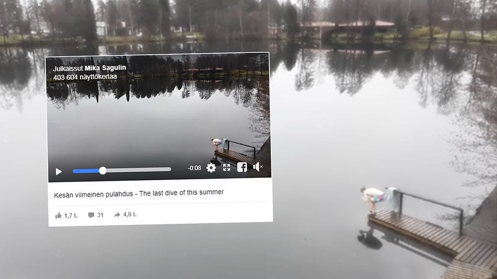 Sosiaalisessa mediassa leviävällä videolla suomalaismies on hyppäämäisillään peilityyneen järveen. Pulahtamisen hetkellä tapahtuu kuitenkin jotain hyvin yllättävää.