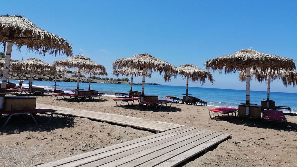 Hän vastaa puheluun lähes autiolta uimarannalta. Yleensä kylä, Platanias, kuhisee turisteja.