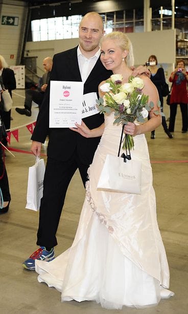 Suomalaispariskunta vihittiin tänään 12.10. Helsingin Messukeskuksessa Hääjuoksu-tapahtuman päätteeksi I Love Me -messuilla tunnelmallisessa tilaisuudessa pariskunnan lähipiirin ja messuvieraiden nähden.