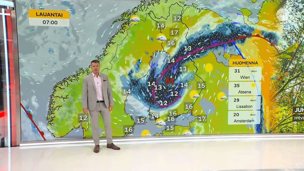 – Suurin osa Suomesta saa kyllä reippaasti vettä niskaansa, arvioi meteorologi Markus Mäntykangas.