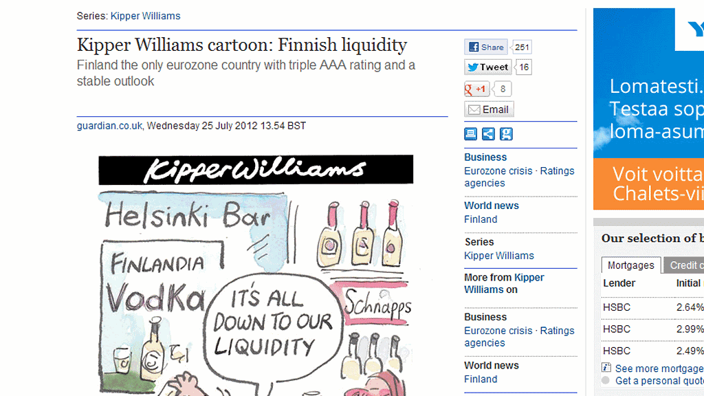 The Guardianin pilapiirtäjä Kipper Williams teki keskiviikon lehteen piirroksen, jossa otetaan kantaa suomalaisten alkoholin kulutukseen sekä maamme hyvään luottoluokitukseen.